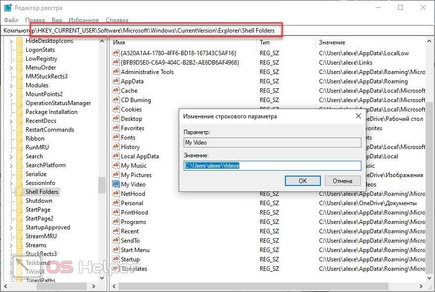 - В строке «Значение» укажите путь по умолчанию. Пользовательские каталоги располагаются на системном разделе (папка Users/имя пользователя).