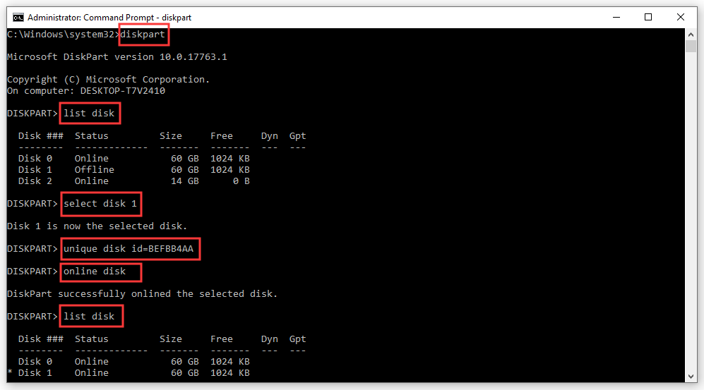 - Вы можете увидеть, какой диск отключен. Затем введите выберите диск * (* означает номер автономного диска) и нажмите Войти .