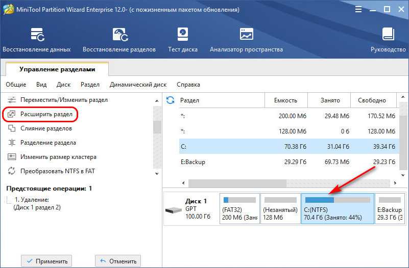 Далее высвобожденное пространство можем присоединить к разделу Windows. Кликаем её раздел, на операционной панели выбираем «Расширить раздел».