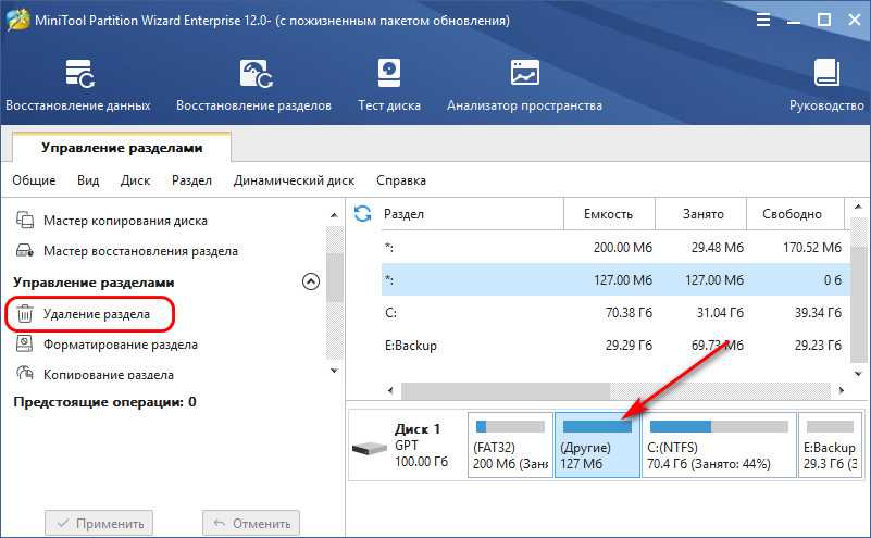 На EFI-системах Windows, установленных на GPT-диске, нам придётся ещё поработать. Возвращаемся к MiniTool Partition Wizard, обращаемся снова к визуальной карте диска. И видим в нашем случае, что в процессе преобразования у нас MSR-раздел утратил свои свойства. Мы просто удалим его. Кликаем его и на панели операций выбираем «Удаление раздела».
