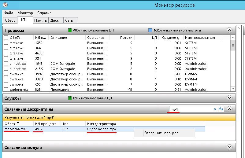 Бывают ситуации, когда при попытке удалить или изменить файл система выводит сообщение, что файл используется другим приложением и не может быть удален. Для поиска блокирующего процесса нужно ввести часть имени файла в разделе “Связанные дескрипторы”, вкладки “ЦП”. При необходимости процесс можно принудительно завершить.