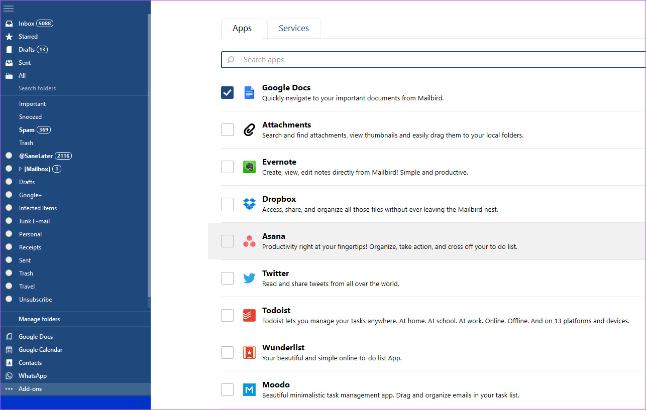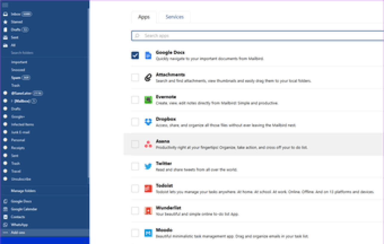Итак, что касается общей структуры, Mailbird не только позволяет интегрировать стандартные приложения, такие как Dropbox или Google Drive, но также поддерживает такие приложения, как Feedly, Todoist, Wunderlist и Slack. Короче говоря, он объединяет множество приложений под одной крышей.