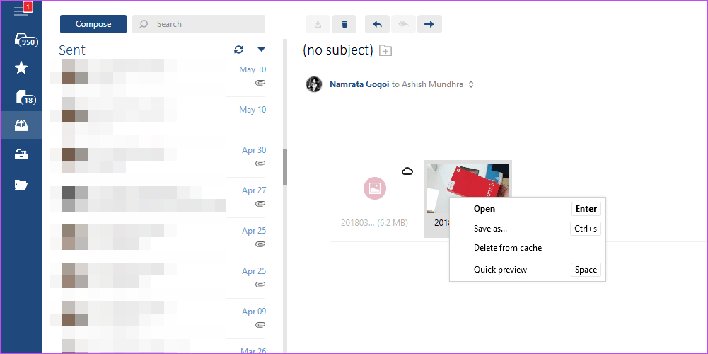 Быстрый просмотр — одна из самых крутых функций Mailbird. Как подсказывает его название, вы можете взглянуть на снимок вложения. Все, что вам нужно сделать, это щелкнуть по нему правой кнопкой мыши и выбрать «Быстрый просмотр».