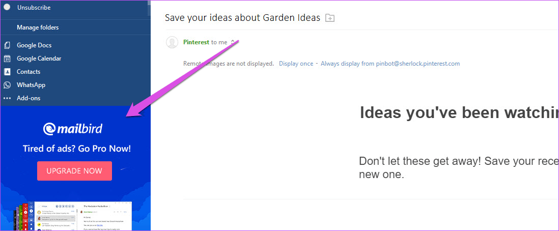 Напротив, бесплатный вариант Mailbird время от времени предлагает вам рекламу «Обновите до Pro». Кроме того, если вы используете бесплатную версию, в правом нижнем углу у вас появится реклама «Обновить сейчас».