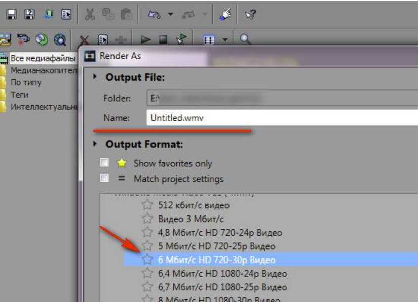 - Далее нажимаем на кнопку «Визуализировать как», даём имя нашему файлу, снова выбираем видео формат и указываем, куда сохранять файл.