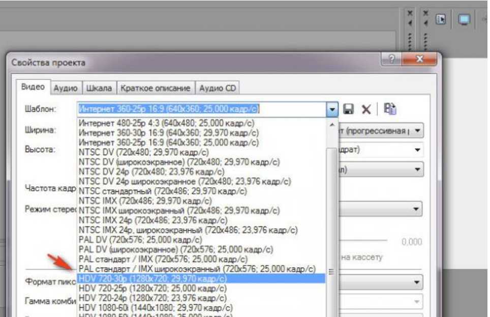 Теперь нам нужно сохранить то, то у нас получилось (либо видео без звука, либо видео с выбранной нами аудиодорожкой). Нажимаем на «Свойства видео» и в открывшемся окне на вкладке «Видео» напротив пункта «Шаблон» выбираем видео формат.
