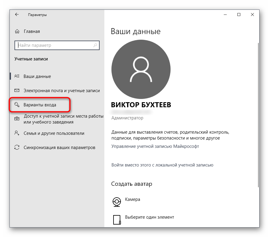 - Нажмите на Учетные записи → Варианты входа.