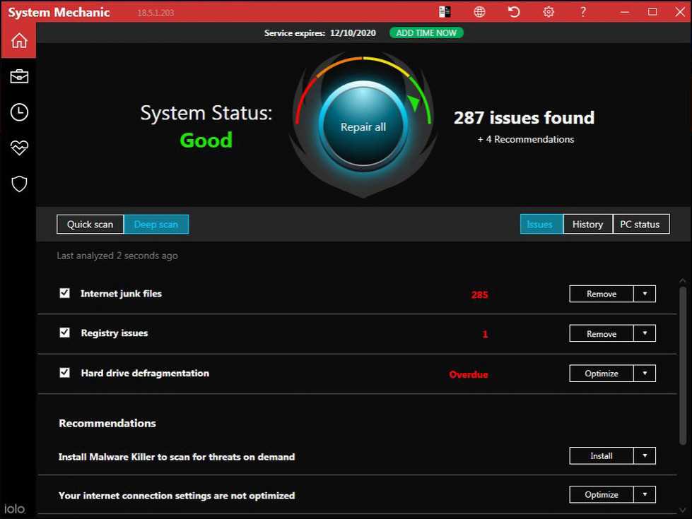 Iolo System Mechanic удаляет ненужные файлы и ненужные приложения, блокирует вредоносные программы и нежелательные программы в автозапуске, очищает оперативную память и стирает различные журналы, истории браузера и кеш.