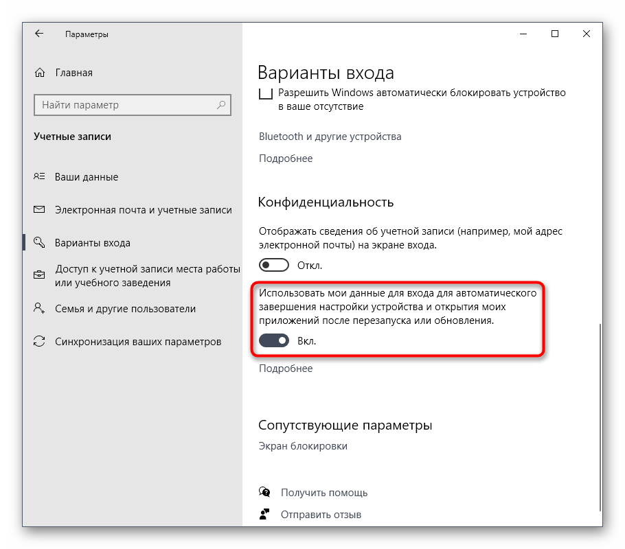 - В разделе «Конфиденциальность» отключите параметр Использовать мои данные для входа для автоматического завершения настройки устройства и открытия моих приложений после перезапуска или обновления.