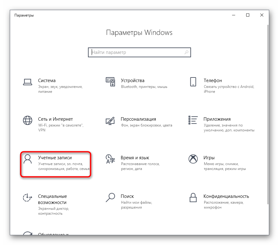 Здесь выберите раздел «Учетные записи».