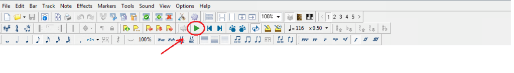 Вы уже получили доступ к табулатуре, запустили её в программе GuitarPro, осталось найти только кнопку «Play». В разных версиях программы она на разных местах, конкретно в GuitarPro 5 (ГитарПро 5) она находиться сверху и посредине (рис. 6).