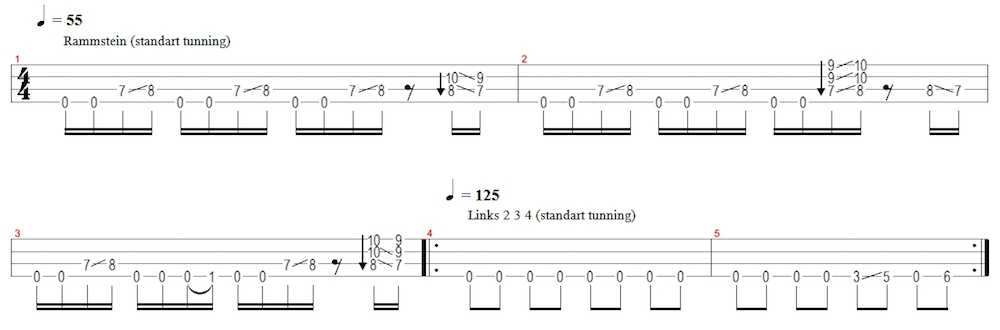 Также в данной нотации встречается надпись Let ring, что подразумевает непрерывное звучание: то есть, не используем глушение предыдущей ноты, когда переходим к следующей – позволяем ей играть дальше.