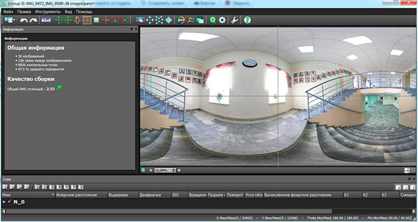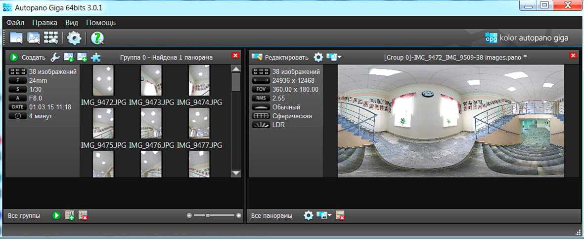 Как уже упоминалось, для этого существуют специальные программы. Запустив Autopano Giga фирмы Kolor мы загрузили в нее фото с первой точки съемки — это была лестница между этажами — и нажал кнопку «создать». Программа немного подумала и выдала готовую панораму: