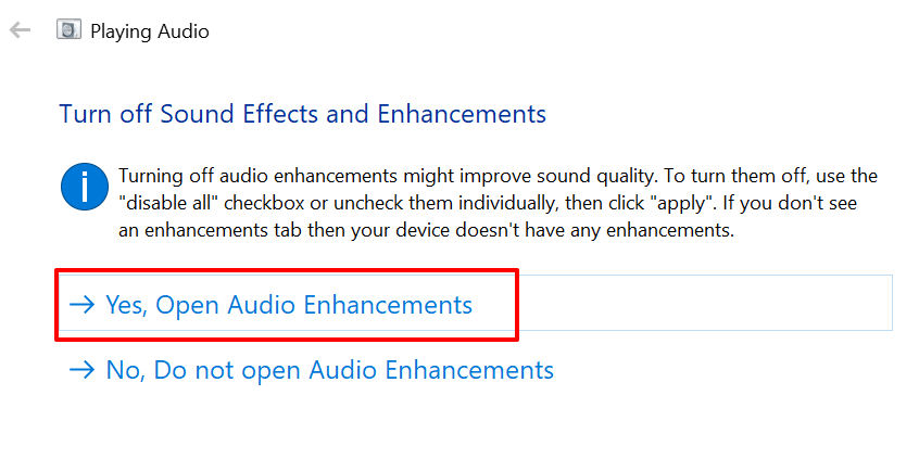 - Следуйте рекомендациям на странице результатов и проверьте, решает ли это проблему. Звуковые эффекты и улучшения также могут дестабилизировать громкость вашего устройства. Скорее всего, вы будете перенаправлены на страницу «Отключить звуковые эффекты и улучшения», где вам будет предложено отключить звуковые эффекты. Чтобы продолжить, выберите «Да, открыть улучшения звука».