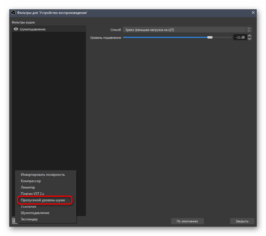 - Для добавления снова перейдите в меню работы с фильтрами, нажмите кнопку в виде плюса и из списка выберите «Пропускной уровень шума».