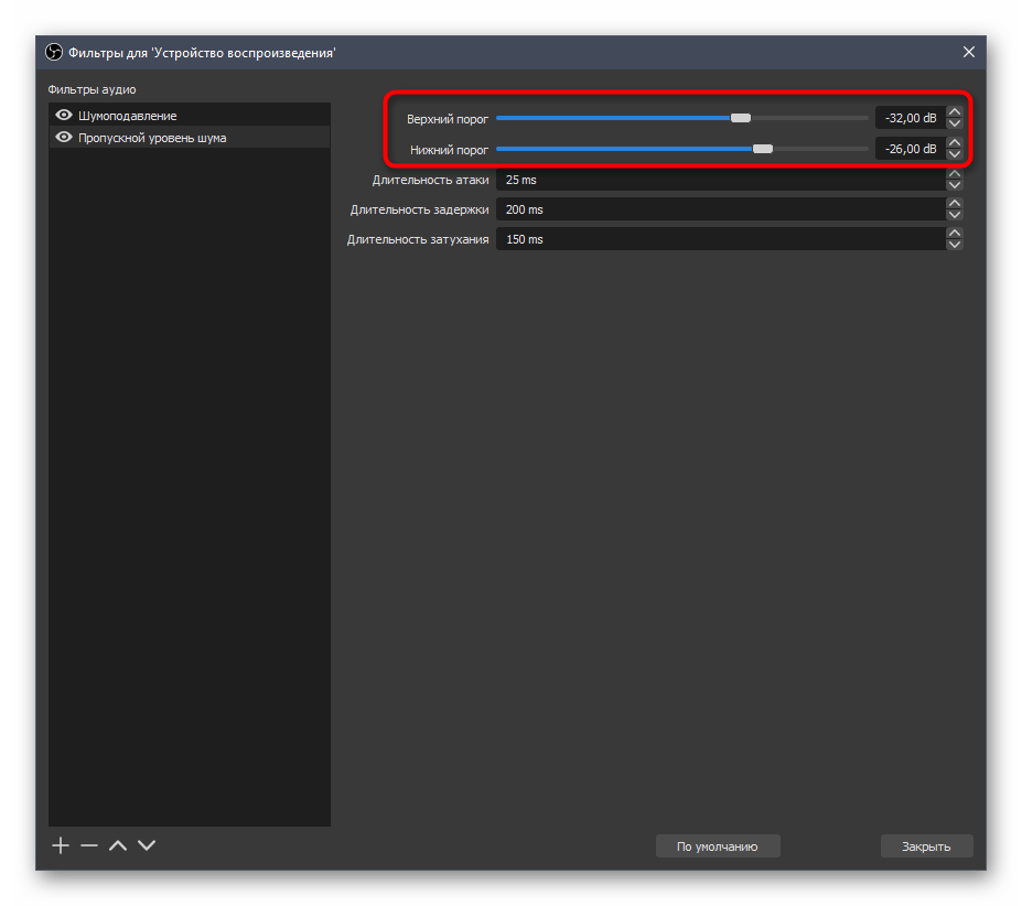 Первые два ползунка отвечают за настройку порога захватываемых шумов. Здесь необходимо ориентироваться на то, в каком диапазоне находятся ненужные звуки, а уже потом редактировать данные параметры.