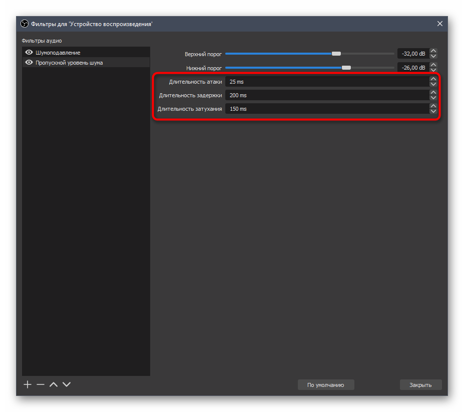 По умолчанию фильтр задавливает дорожку аж на 12 децибел, что ощущается как резкое уменьшение громкости и только отвлекает. -4 дБ – оптимальный вариант для ненавязчивой тихой музыки. 0,2 секунды (по умолчанию 0,5) – время, за которое дорожка изменит свою громкость.