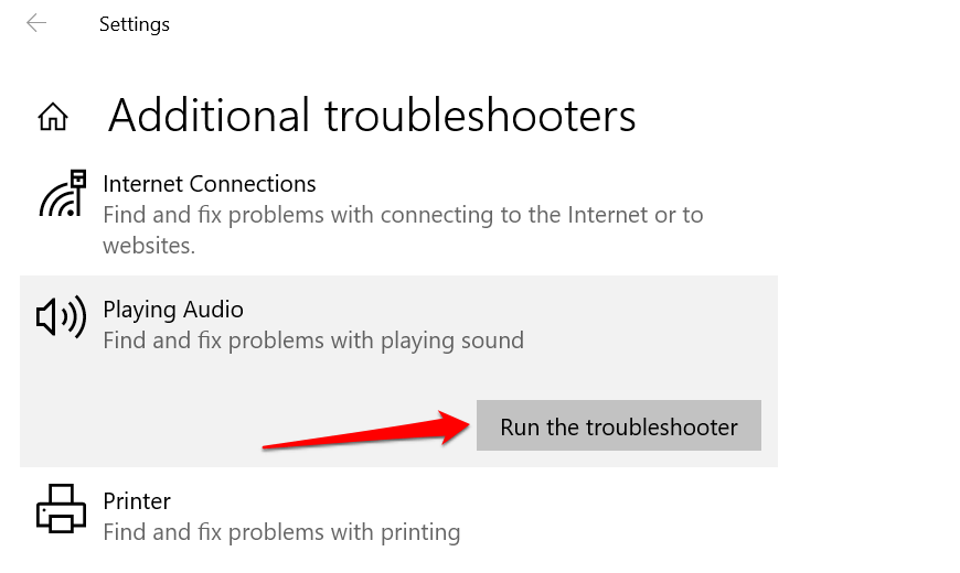 - Выберите «Настройки»> «Обновление и безопасность»> «Устранение неполадок»> «Дополнительные средства устранения неполадок»> «Воспроизведение звука» и выберите «Запустить средство устранения неполадок».