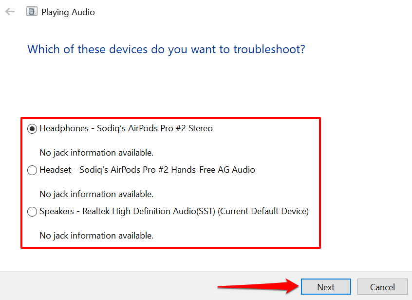 - Выберите аудиоустройство или наушники со слишком высокой громкостью и нажмите Далее.
