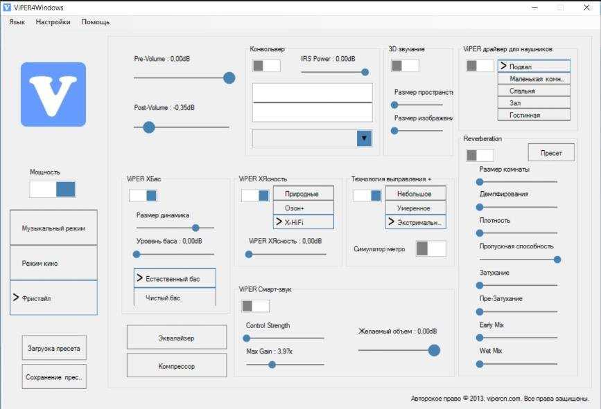 Удачный эквалайзер на компьютер с Windows, который не умеет обрабатывать и записывать новую музыку, но корректирует воспроизводимый звук ОС. Является полнофункциональной системой корректировки звука с массой настроек: управление импульсами, обеспечение объёмного звука, и остальные функции рендеринга. Эффекты есть, но они стандартны. Из профессиональных технологий: реверберация, компрессор, лимитер и прочее.