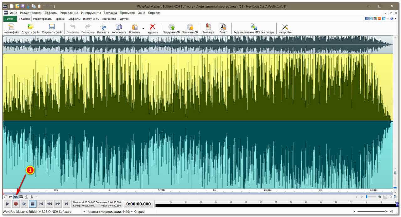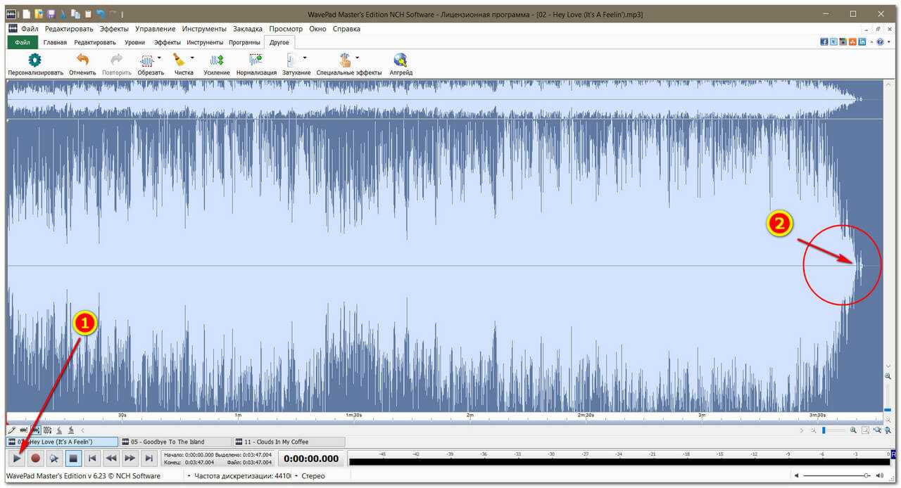 После чистки аудиофайла, можно прослушать его, кликнув по кнопке: Play (стрелка 1). Однако, в конце записи помимо большого участка тишины, были замечены небольшие огрехи. После затухания звука появилась тишина, потом опять какой-то звук, затем тишина, звук и снова тишина длительностью более 5 секунд.