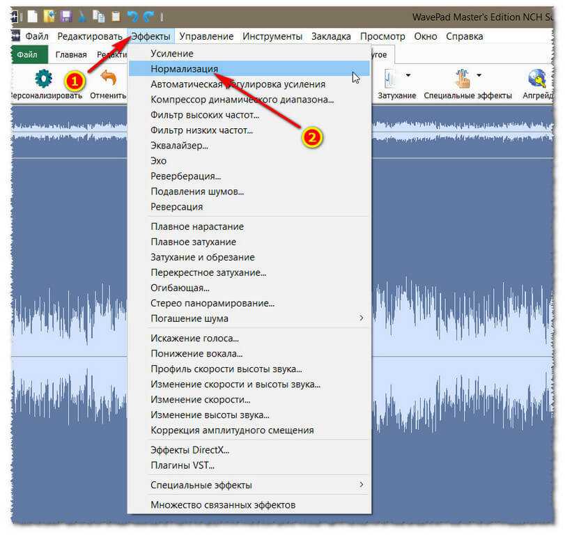 Вновь откройте: Эффекты (стрелка 1) и, выберите: Усиление (стрелка 2).