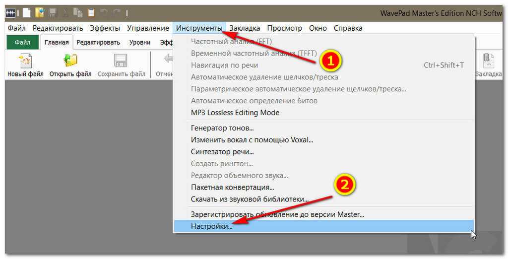 В горизонтальном меню кликните по кнопке: Инструменты (стрелка 1) и, в выпадающем контекстном меню, выберите: Настройки (стрелка 2).