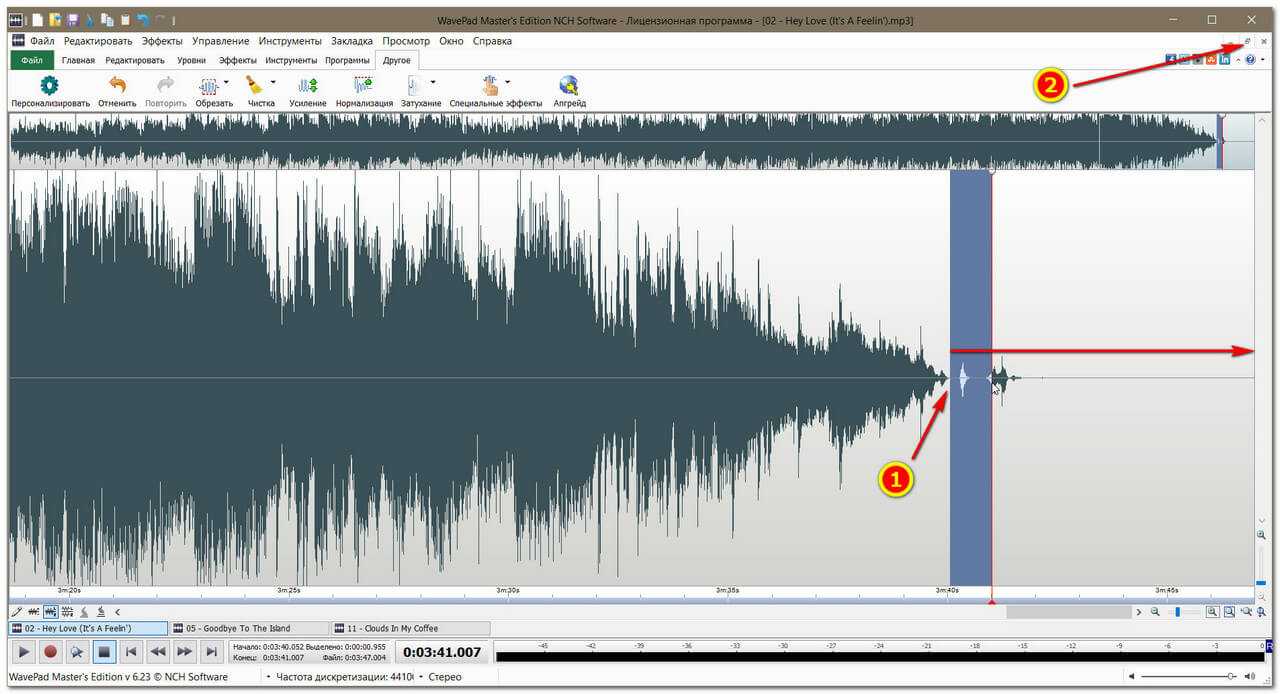 Для того, чтобы устранить обнаруженные огрехи и удалить тишину, подведите курсор мыши к окончанию затухания звука (стрелка 1). Затем, зажмите левую клавишу мыши и, не отпуская её, ведите курсор вправо до самого упора (указано стрелкой).