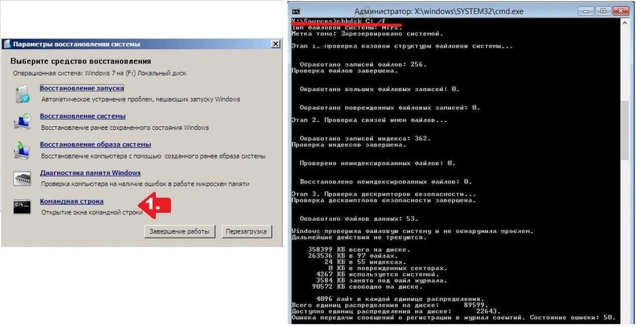 chkdsk С: /f /r (если проблемный диск – С). Дождитесь окончания процесса проверки и перезагрузите ваш компьютер, система должна загрузится без проблем;