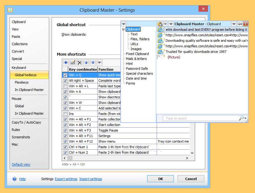 Что примечательно, можно перенести в буфер обмена Windows любую из сохраненных в Clipdiary записей или же файл, даже не открывая окно этой программы. Для этого достаточно воспользоваться сочетанием клавиш Ctrl+Shift+стрелка вверх или вниз. Чуть подробнее.