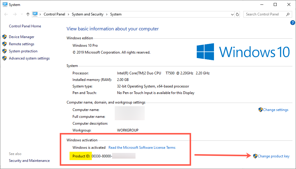 Проверьте ключ продукта в сведениях о системе