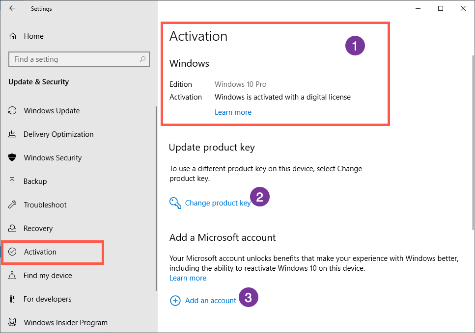 - Если у вас уже активирована версия Windows, вы увидите экран, как показано ниже, где указано, что версия была активирована с помощью цифровой лицензии или ключа.