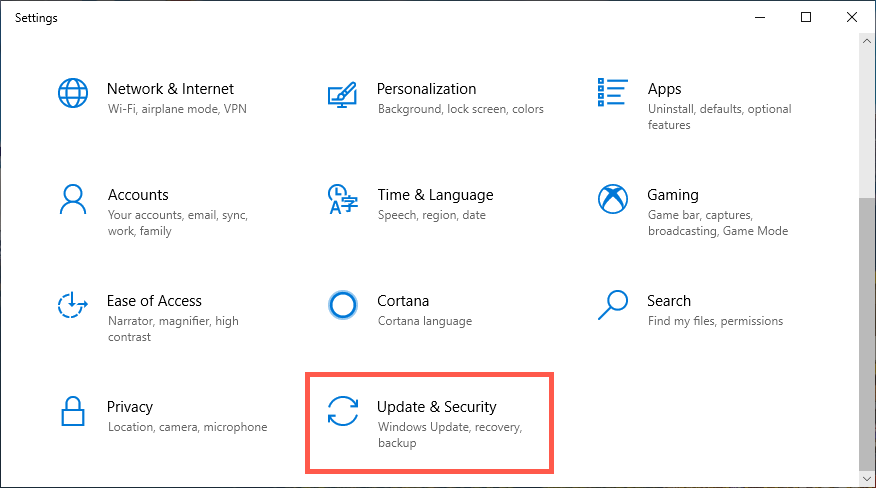 - Перейдите в раздел «Обновление и безопасность».