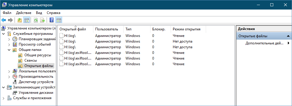 Наконец, в подразделе «Открытые файлы» выводится список всех файлов и папок, которые в данный момент открыты подключившимися к расшаренной папке пользователями. Помимо пути к ресурсу, указываются также имя работающего с ним пользователя, тип подключения и режим открытия (чтение и/или запись).