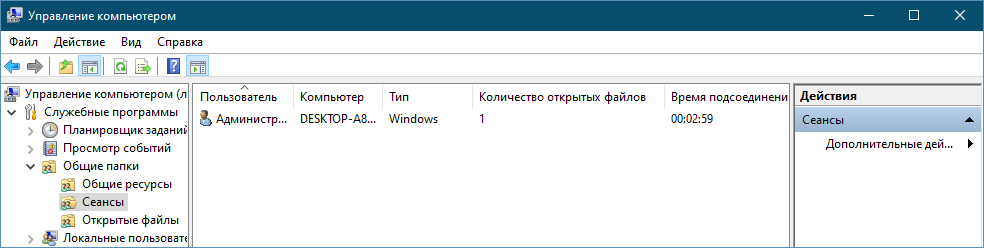 В подразделе «Сеансы» предоставляется информация о пользователях, подключенных к общему ресурсу, в частности, имя пользователя и компьютера в локальной сети, тип подключения и количество открытых файлов, время подсоединения и время простоя.