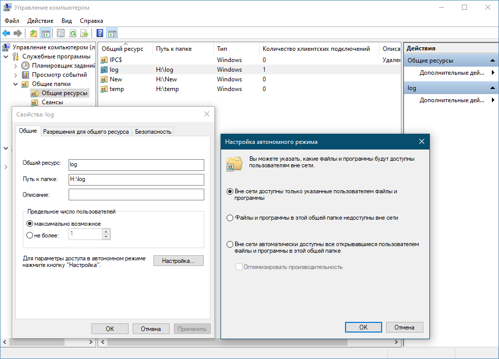Для каждого открытого ресурса выводятся сведения — количество активных подключений, тип и путь к папке, если же кликнуть по ресурсу дважды мышкой, откроется окно свойств ресурса, в котором можно установить ограничения на его использование — задать лимит на количество одновременных активных подключений, изменить права доступа и так далее.