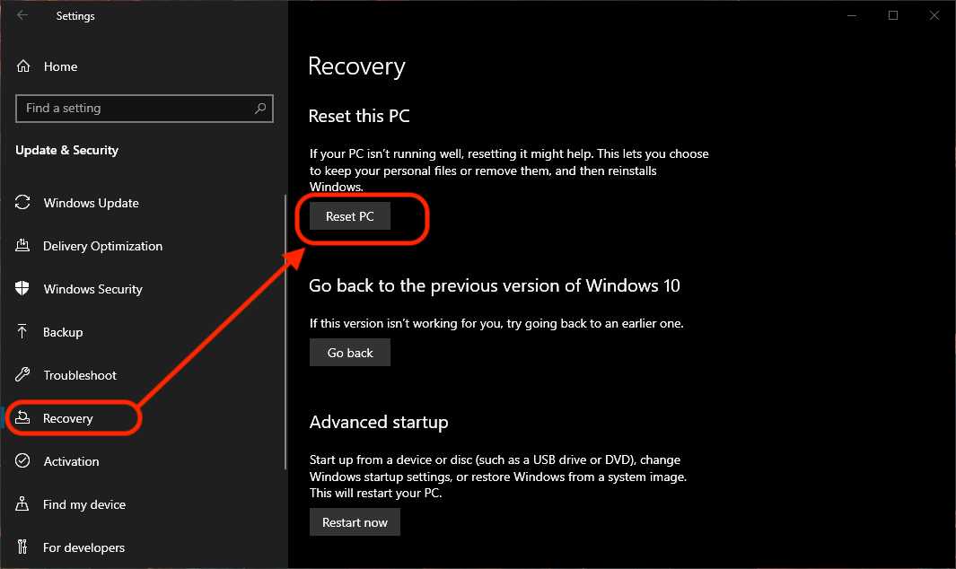 1. Объединить в «Settings»→«Восстановление»→«Сбросить этот ПК».