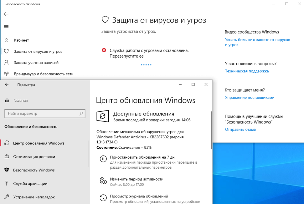 Обратите внимание! В апреле 2020 года вышло очередное обновление механизма обнаружения угроз. Все пользователи, в которых обновление ещё не установилось могут наблюдать ошибку: служба работы с угрозами остановлена