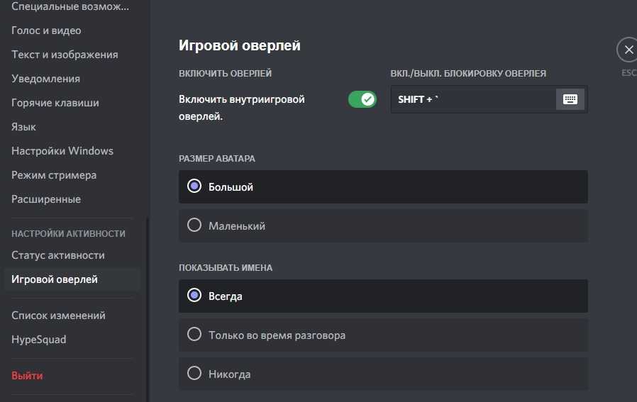 - Включить/выключить блокировку оверлея. Здесь необходимо указать сочетание клавиш, с помощью которого можно скрывать и отображать окно оверлея.