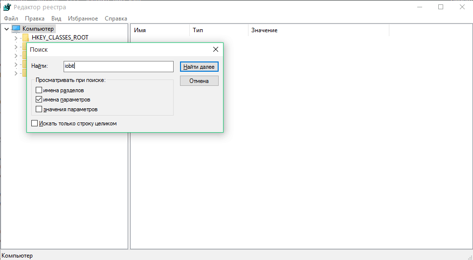 5. Откроется окно реестра, в котором вам понадобится нажать сочетание клавиш Ctrl+F, чтобы отобразить окно поиска и ввести в нем название искомой программы IObit. Удалите все значения, связанные с этой программой. Завершив работу, закройте окно реестра.