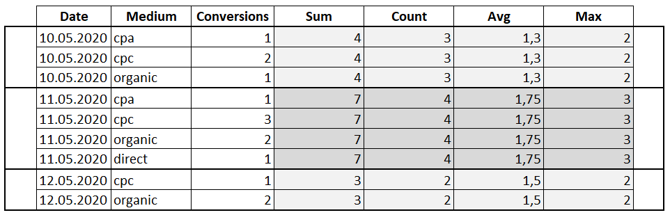 SELECT Date , Medium , Conversions , SUM(Conversions) OVER(PARTITION BY Date) AS 'Sum' , COUNT(Conversions) OVER(PARTITION BY Date) AS 'Count' , AVG(Conversions) OVER(PARTITION BY Date) AS 'Avg' , MAX(Conversions) OVER(PARTITION BY Date) AS 'Max' , MIN(Conversions) OVER(PARTITION BY Date) AS 'Min' FROM Orders