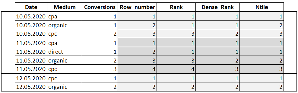 SELECT Date , Medium , Conversions , ROW_NUMBER() OVER(PARTITION BY Date ORDER BY Conversions) AS 'Row_number' , RANK() OVER(PARTITION BY Date ORDER BY Conversions) AS 'Rank' , DENSE_RANK() OVER(PARTITION BY Date ORDER BY Conversions) AS 'Dense_Rank' , NTILE(3) OVER(PARTITION BY Date ORDER BY Conversions) AS 'Ntile' FROM Orders