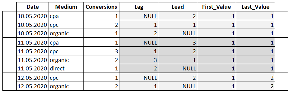 SELECT Date , Medium , Conversions , LAG(Conversions) OVER(PARTITION BY Date ORDER BY Date) AS 'Lag' , LEAD(Conversions) OVER(PARTITION BY Date ORDER BY Date) AS 'Lead' , FIRST_VALUE(Conversions) OVER(PARTITION BY Date ORDER BY Date) AS 'First_Value' , LAST_VALUE(Conversions) OVER(PARTITION BY Date ORDER BY Date) AS 'Last_Value' FROM Orders