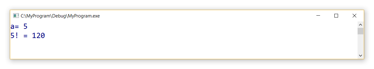 #define _CRT_SECURE_NO_WARNINGS // для возможности использования scanf#include <stdio.h>int fact(int num) // вычисление факториала числа num{ if (num <= 1) return 1; // если число не больше 1, возвращаем 1 else return num*fact(num — 1); // рекурсивный вызов для числа на 1 меньше}// Главная функцияint main() { int a, r; printf(«a= «); scanf(«%d», &a); r = fact(a); // вызов функции: num=a printf(«%d! = %d», a, r); getchar(); getchar(); return 0;}