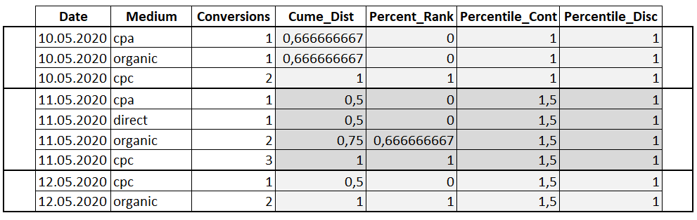 SELECT Date , Medium , Conversions , CUME_DIST() OVER(PARTITION BY Date ORDER BY Conversions) AS 'Cume_Dist' , PERCENT_RANK() OVER(PARTITION BY Date ORDER BY Conversions) AS 'Percent_Rank' , PERCENTILE_CONT(0.5) WITHIN GROUP (ORDER BY Conversions) OVER(PARTITION BY Date) AS 'Percentile_Cont' , PERCENTILE_DISC(0.5) WITHIN GROUP (ORDER BY Conversions) OVER(PARTITION BY Date) AS 'Percentile_Disc' FROM Orders