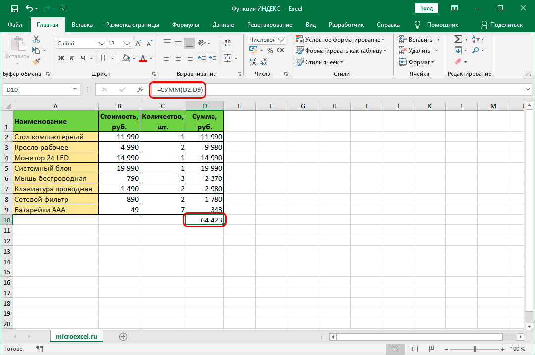 Оператор ИНДЕКС можно использовать вместе с функцией СУММ, формула которой выглядит так: