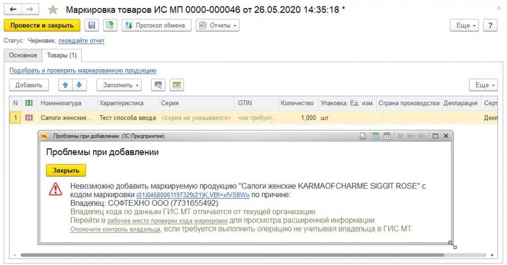 Когда маркировочный код не проходит проверку по статусу или владельцу и информационной системе «Честный знак», то его невозможно добавить в форму подбора и проверки. При этом пользователь получает соответствующее уведомление.
