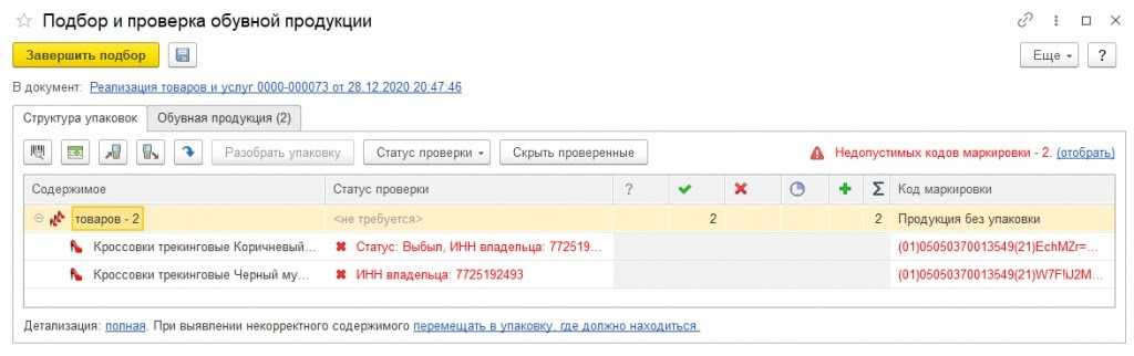 Если пользователь в ходе проверки кодов маркировки обнаружит некорректный для этой операции статус кода или принадлежность владельцу, в графе «Статус проверки» указывается результат этой проверки в виде «Статус:…» и/или «ИНН владельца…» с проставлением текущего (некорректного) статуса и/или владельца в информационной системе «Честный знак». Чтобы указать данный момент оператору, статус и код указываются красным.