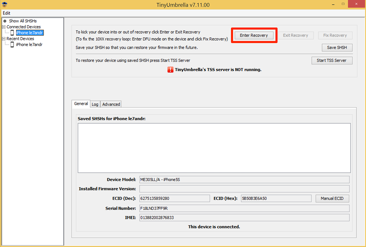 - Возможности TinyUmbrella выходят далеко за рамки вывода iOS-устройств из петли восстановления. Она позволяет ввести iPhone и iPad в Recovery Mode без манипуляции с кнопками (для этого щелкните на «Enter Recovery»), а также вывести их из режима восстановления без принудительной перезагрузки (кнопка «Exit Recovery» (Выйти из восстановления)), если, конечно, устройство не попало в петлю восстановления.