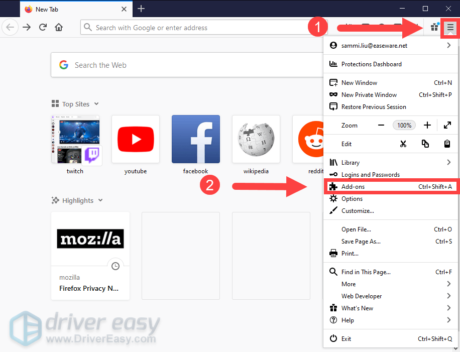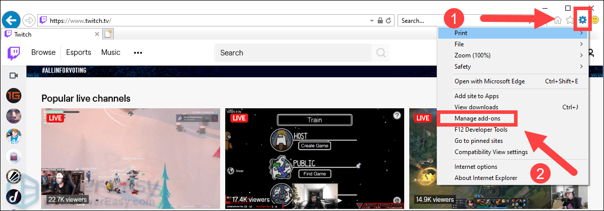1) Нажмите на инструменты значок и выберите Управление дополнениями .